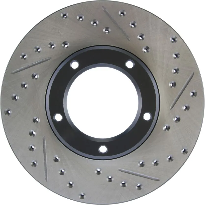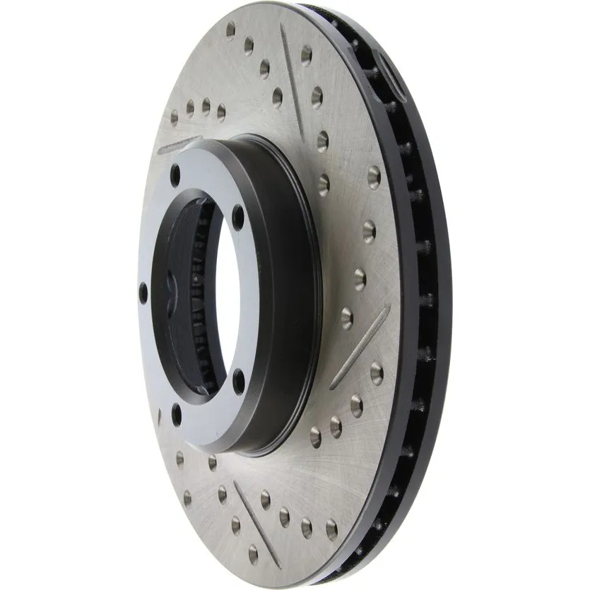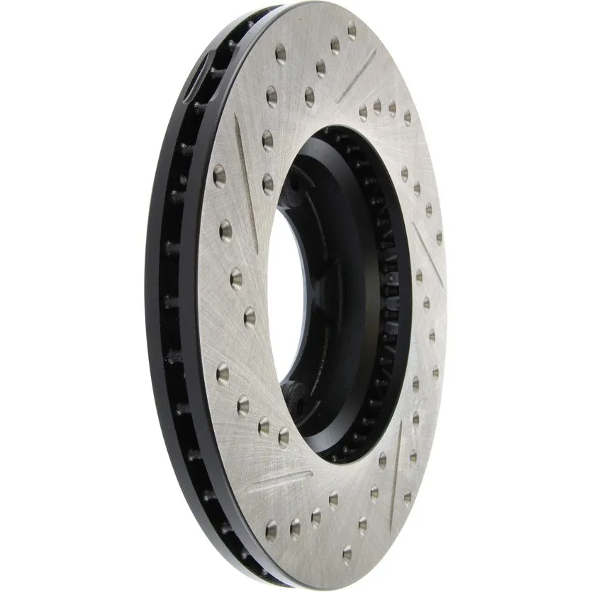 StopTech Drilled and Slotted Sport Rotors are 1-piece direct replacement brake discs for factory brake systems and stock calipers that look great behind your wheels – and offer significantly improved braking performance. The unique cross-drilling and slotting aids with heat and brake dust dispersal; prevents glazing of the pads; adds bite and improves wet and dry braking performance. Built to last; the black e-coating provides protection from corrosion and the high carbon metallurgy (in most applications) offers quieter operation; better crack resistance and increased performance.