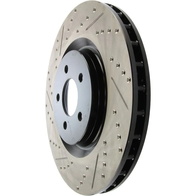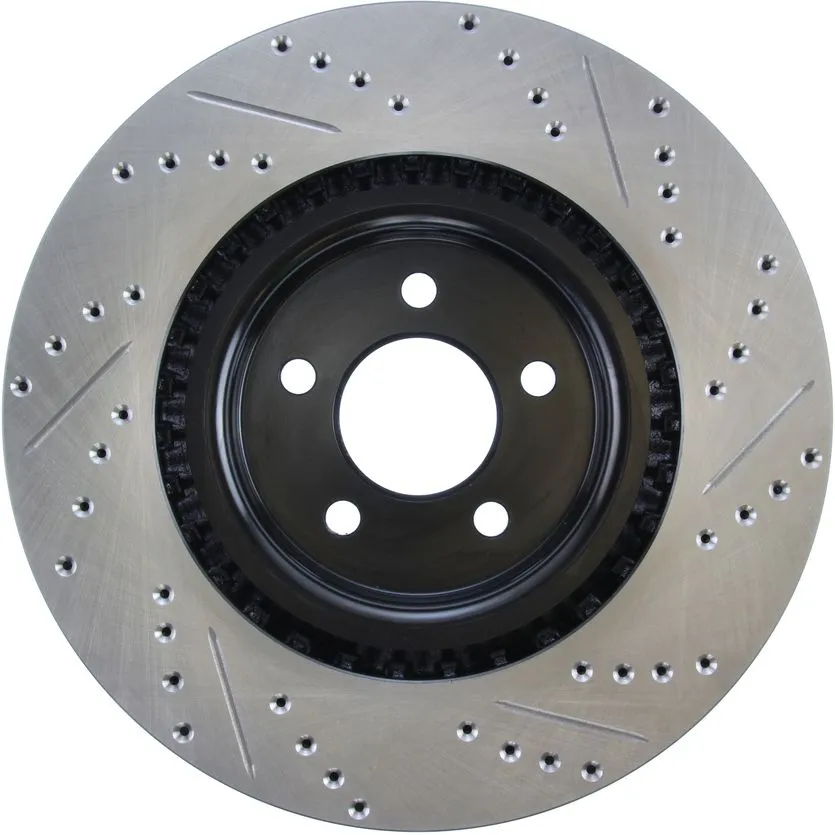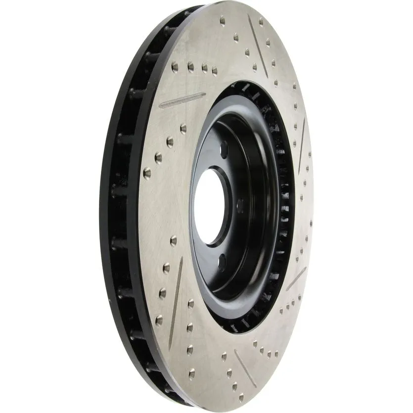 StopTech Drilled and Slotted Sport Rotors are 1-piece direct replacement brake discs for factory brake systems and stock calipers that look great behind your wheels – and offer significantly improved braking performance. The unique cross-drilling and slotting aids with heat and brake dust dispersal; prevents glazing of the pads; adds bite and improves wet and dry braking performance. Built to last; the black e-coating provides protection from corrosion and the high carbon metallurgy (in most applications) offers quieter operation; better crack resistance and increased performance.