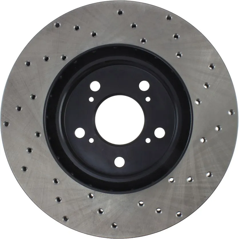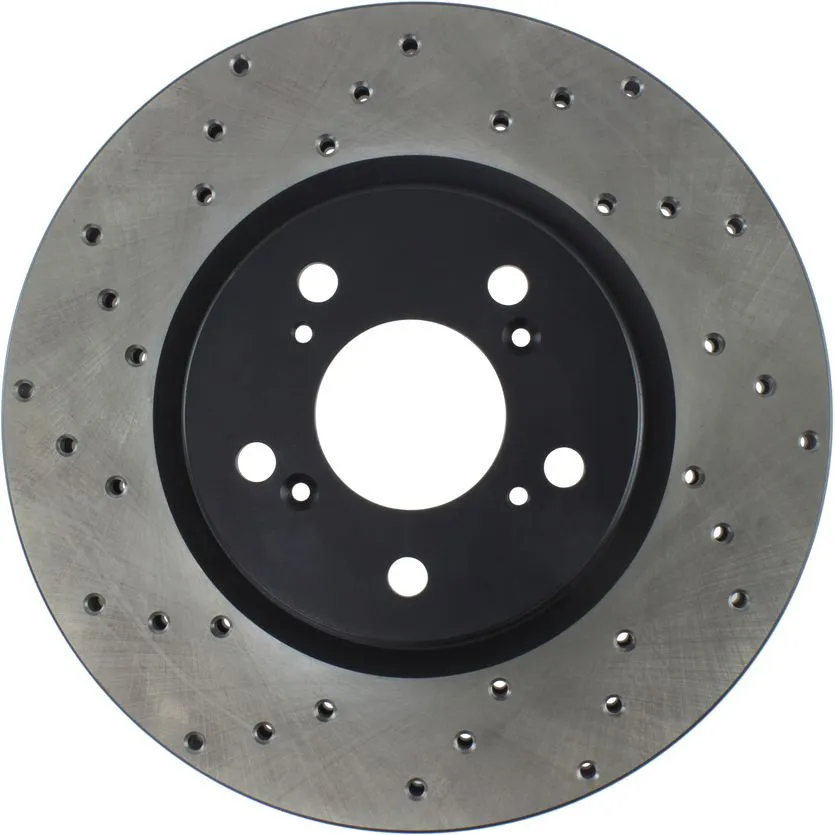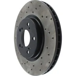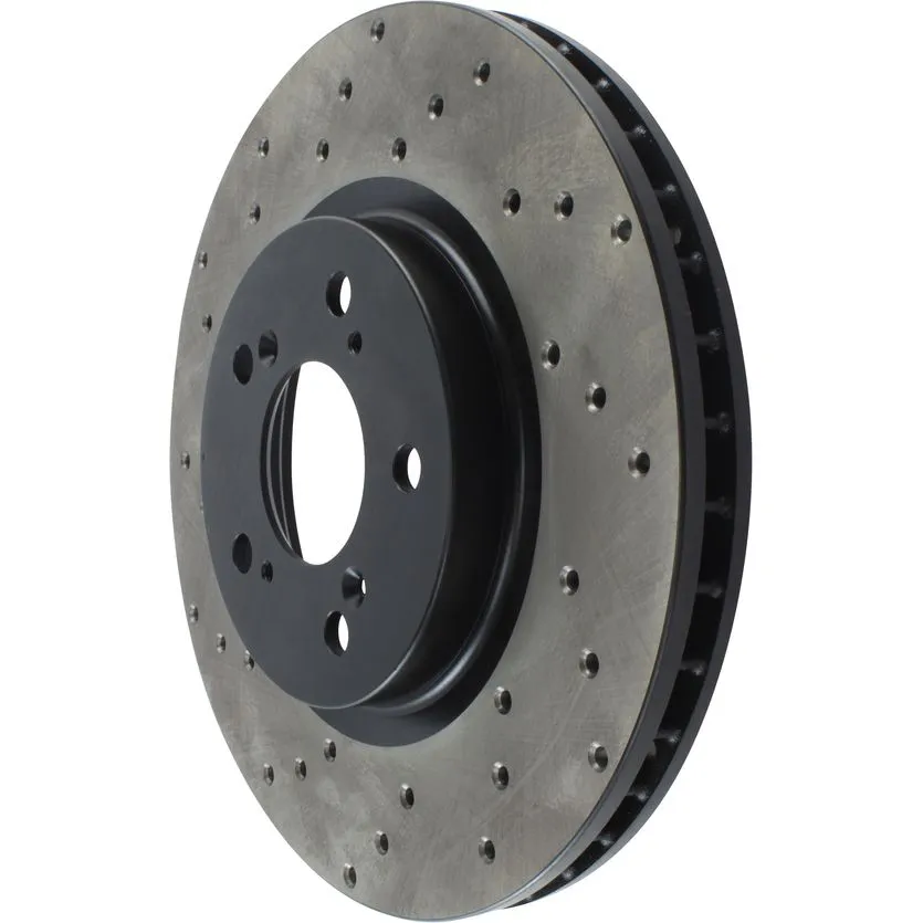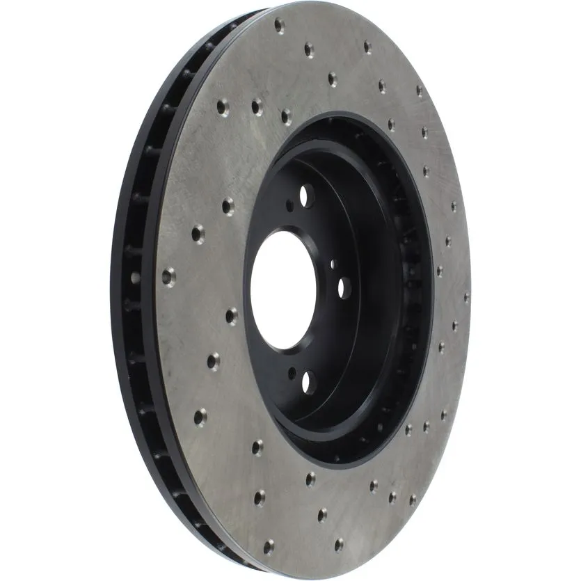 StopTech Drilled Sport Rotors are 1-piece direct replacement brake discs for factory brake systems and stock calipers that look great behind your wheels – and offer significantly improved braking performance. The unique cross-drilling aids with heat and brake dust dispersal; prevents glazing of the pads; adds bite and improves wet and dry braking performance. Built to last; the black e-coating provides protection from corrosion and the high carbon metallurgy (in most applications) offers quieter operation; better crack resistance and increased performance.