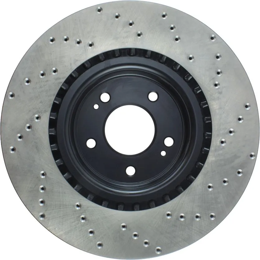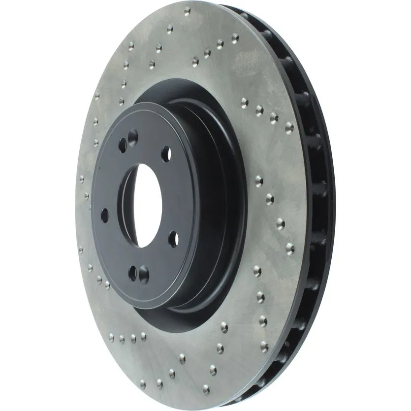 StopTech Drilled Sport Rotors are 1-piece direct replacement brake discs for factory brake systems and stock calipers that look great behind your wheels – and offer significantly improved braking performance. The unique cross-drilling aids with heat and brake dust dispersal; prevents glazing of the pads; adds bite and improves wet and dry braking performance. Built to last; the black e-coating provides protection from corrosion and the high carbon metallurgy (in most applications) offers quieter operation; better crack resistance and increased performance.